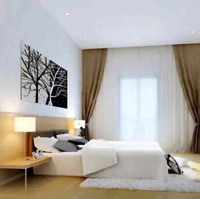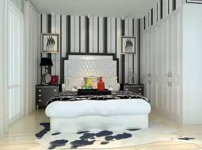 整个空间真的只是刚好能满足一张床的尺寸,横向空间不够,那就在纵向上做文章!黑白条纹以及亮色的装饰品的选取,让小空间更为出彩……即便如此,也不忘记边柜的安置以及墙面装饰画的出现。